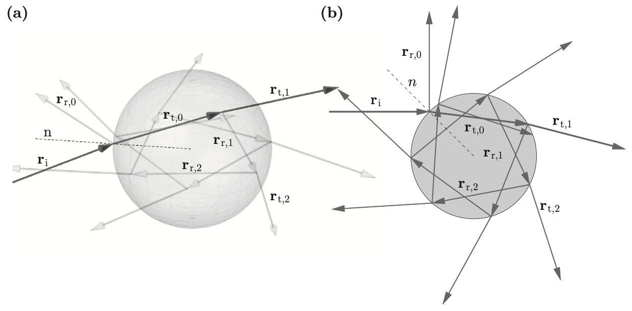 , where is the unit vector in the direction of propagation. For example, a laser beam of power =3mW gives a force of 1.3E-11N. Though minuscule, in the nanometer scale this force is enough to interact with atoms. The total force acting on a spherical surface due to an incident ray is where , represents direction of the initial incident ray, represents direction of the first reflected ray due to first incident ray, represents all transmitted ray from all subsequent internal reflections, as dictated by snells law. Notice we ignore summation on reflected term, as when is incident on surface, most power is carried by . Since transmission carries most of the power, we can ignore subsequent internal reflections. can be subdivided into the sum of the scattering force, in the direction of the incoming ray and the gradient force, , which is perpendicular to the incoming ray. Multiplying the components of by to construct dimensionless quantities known as the trapping efficiencies: and , where
