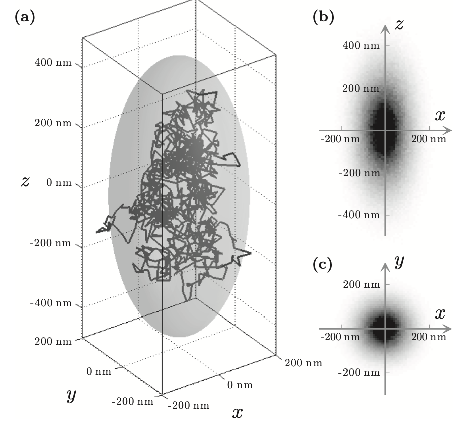 where z is the direction of propagation of the beam, the stiffness is described by , , is the particle friction coefficient, and are independent white noises. A corresponding system of finite difference equations can be found. =1.0 fN/nm and =0.2 fN/nm, since trapping stiffness is larger along propagation axis, the particle explores an ellipsoidal volume inside the trap (Pesce et al. 2020).