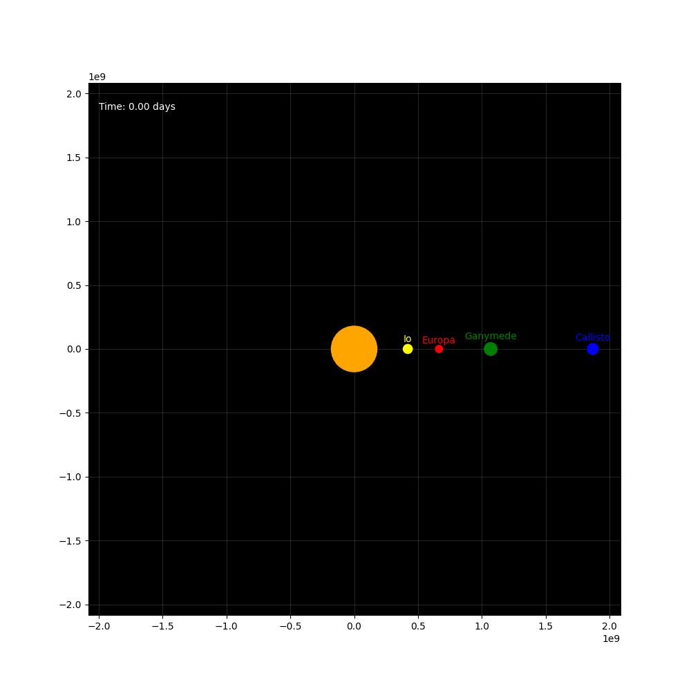 The goal of this article is to explore how we can model multi-body systems using numerical techniques and simplifying assumptions. We will explore the Jupiter-Galilean Moons system to see a simple implementation of multi body orbits. In a later article, we will discuse a more accurate simulation of the system.